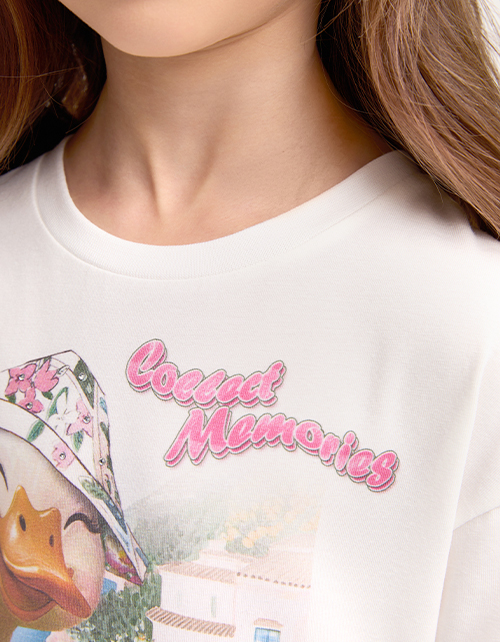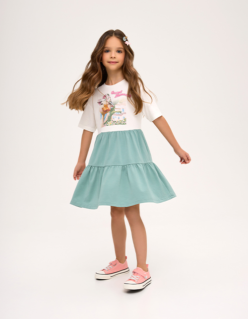 Платье А-силуэта из мягкого хлопкового трикотажа. Каскадная юбка создаёт лёгкое, воздушное движение. Короткий приспущенный рукав добавляет расслабленности. Авторский цифровой принт и стразы делают образ ярким. Мягкая рибана по горловине.