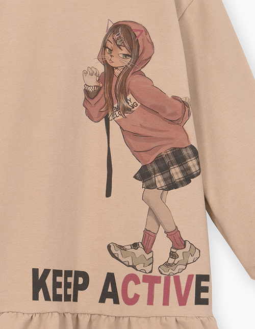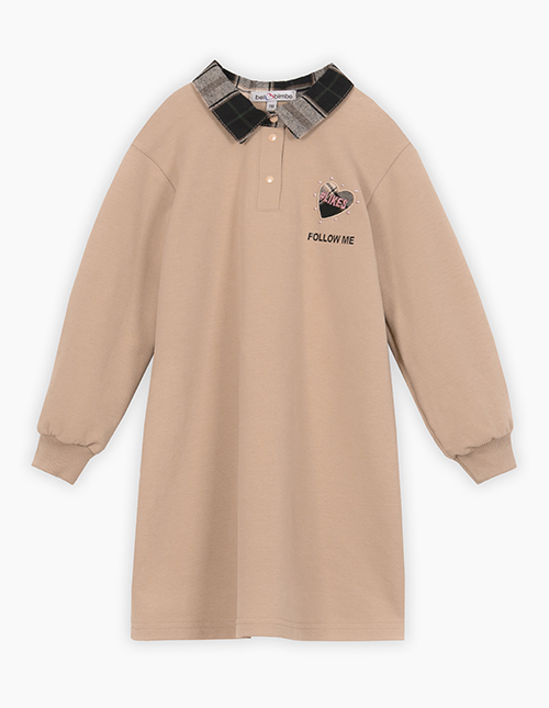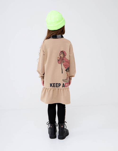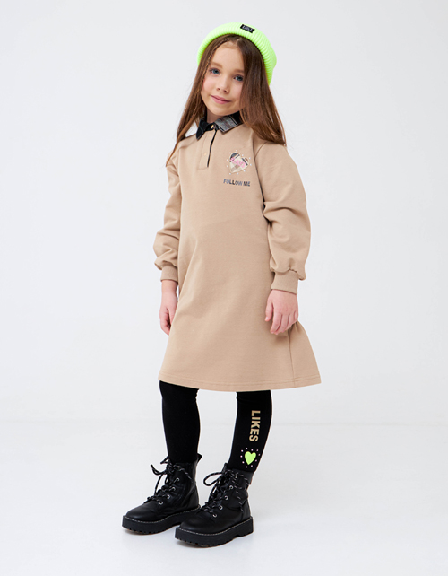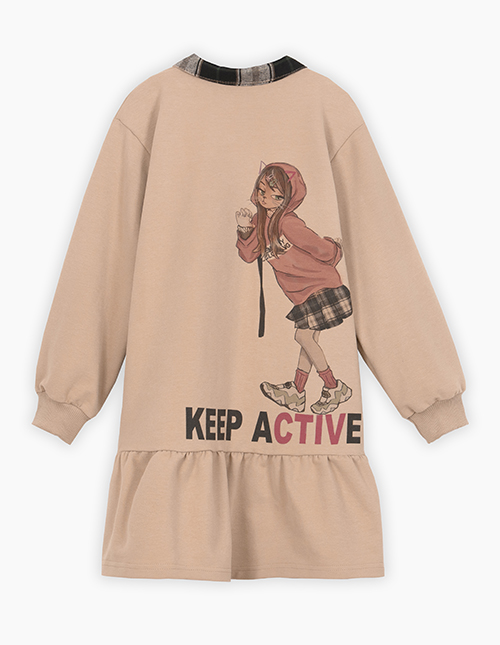 Комфортное платье-поло на кнопках. Модель А-образного силуэта с длинным рукавом. Клетчатый отложной воротник. Изделие с акцентным принтом на спинке. Платье выполнено из мягкого и бархатистого футера .