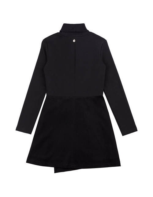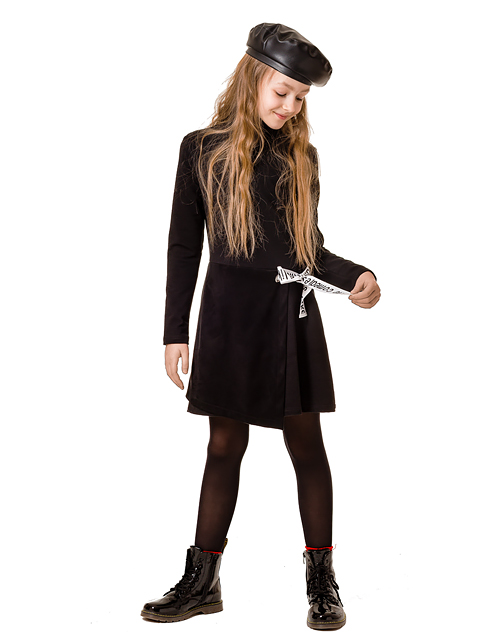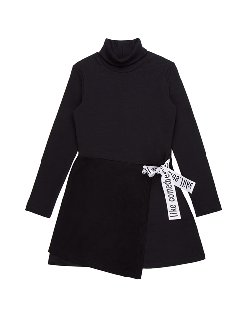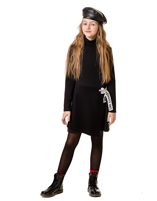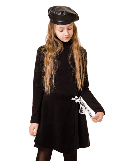 Чтобы быть в тренде, девочке понадобится стильное платье, созданное из контрастных материалов, с модным запахом. Актуальная расцветка, лента с графическим принтом, теплое горлышко с отворотом позволят моднице превосходно выглядеть в любой ситуации.