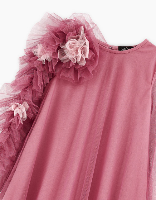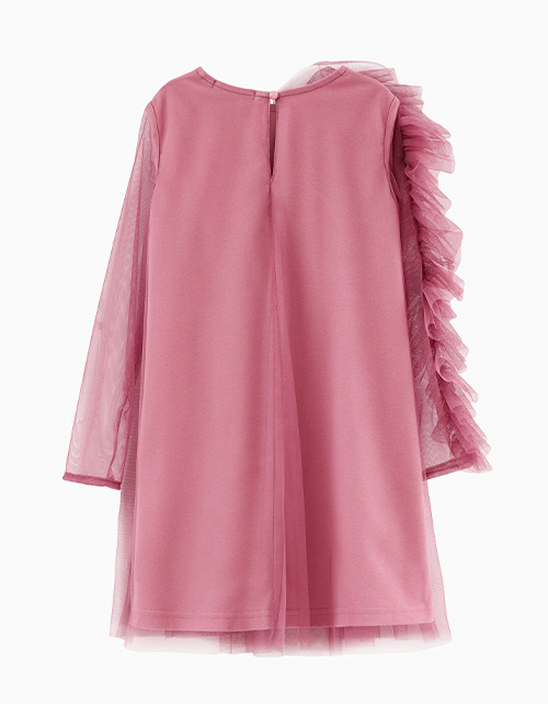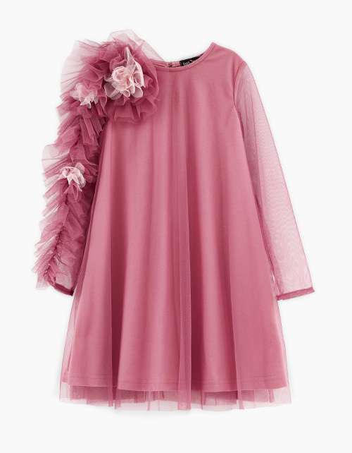 Романтичное платье тёмно-розового оттенка для девочки. Модель комфортного А-образного силуэта. Застёжка на пуговицу. Комбинация материалов: кулирная гладь и мягкое сетчатое полотно. Платье декорировано отлетными элементами из сетки по плечу и рукаву.