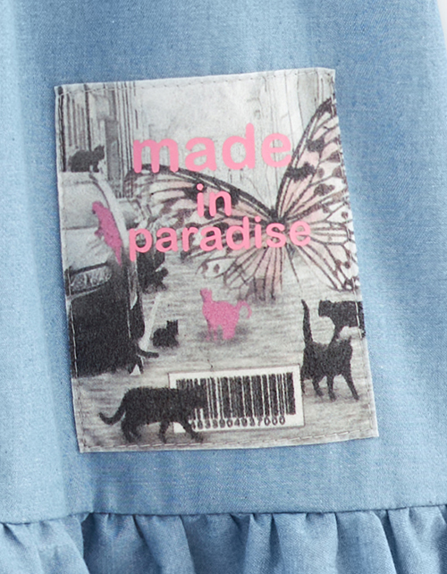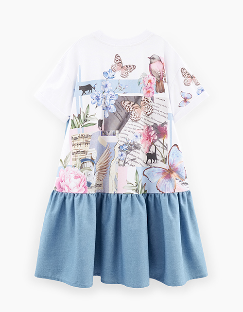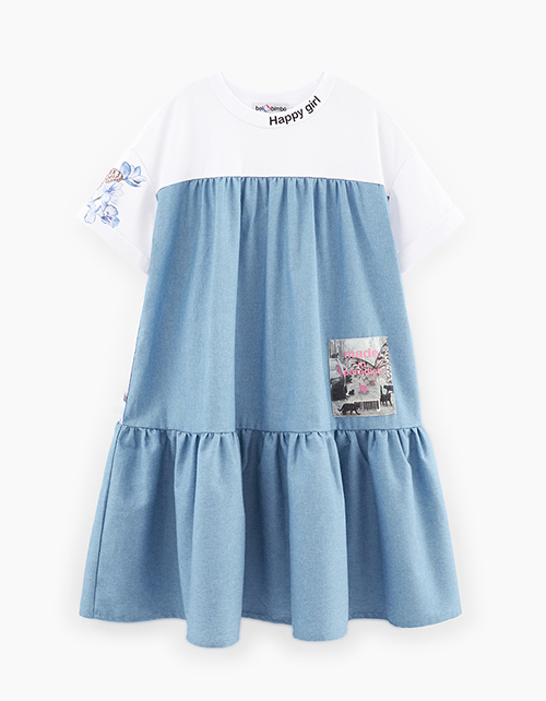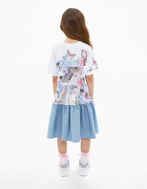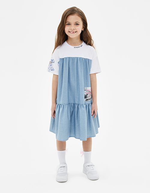 Романтичное платье с коротким рукавом для девочки. Модель комфортного трапециевидного силуэта. Спущенная линия плеча. Рукава с манжетами. Комбинация материалов: джинс и кулирная гладь. Платье декорировано авторскими принтами и лэйбой.
