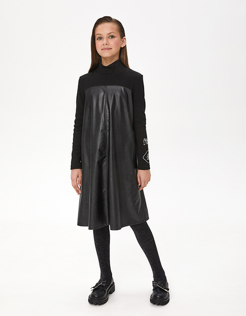 Стильное чёрное платье для девочки. Комфортный А-образный силуэт. Спущенная линия плеча. Воротник-стойка. Имитация комплекта гольфа из рибаны в рубчик и сарафана из эко-кожи. Лаконичный авторский декор.
