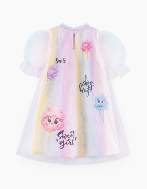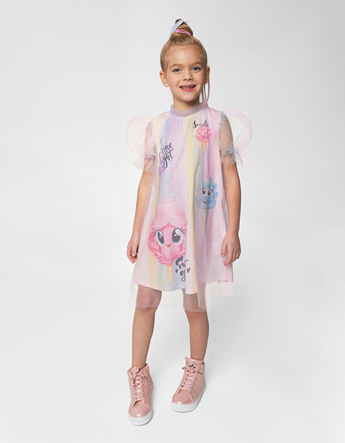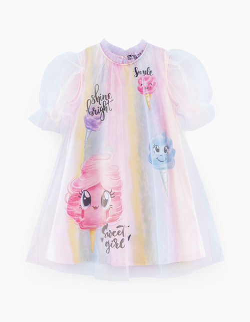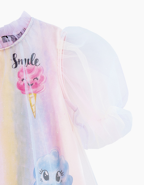 Нарядное платье с принтом тай-дай. Модель А-образного силуэта с коротким рукавом. Платье декорировано радужной сеткой и 3D-принтом.