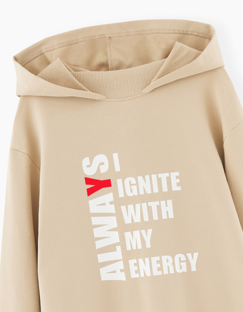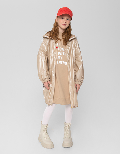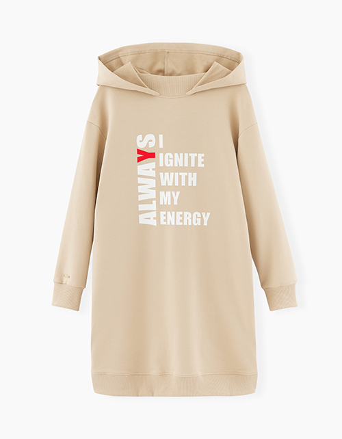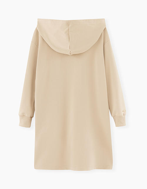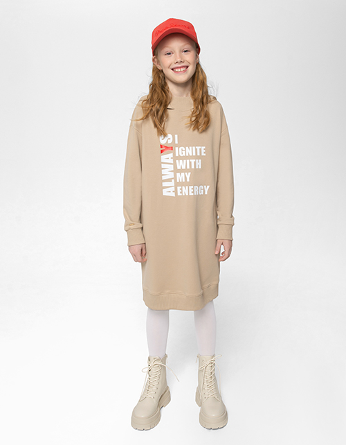 Стильное платье-худи прямого силуэта. Трендовый оттенок "холодный кофе" достигается при помощи браш-эффекта на трикотажном полотне. Модель декорирована нашивками и текстовым принтом.