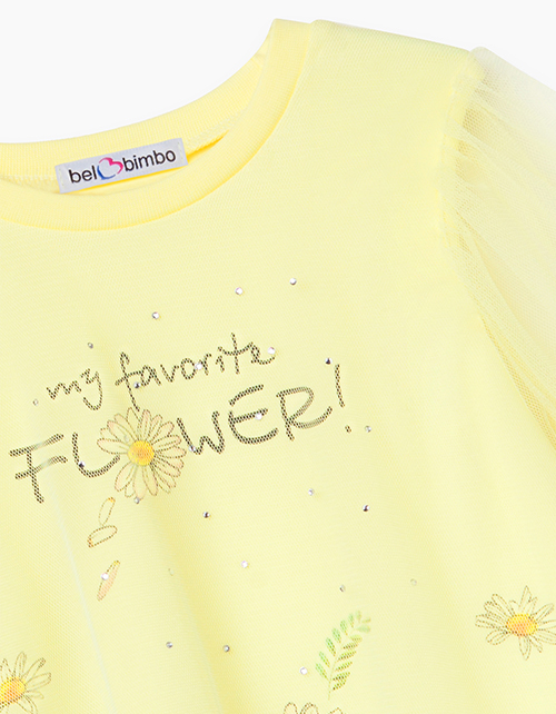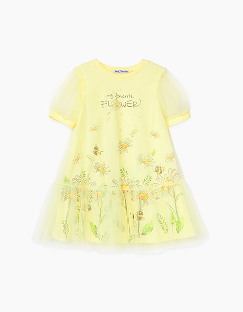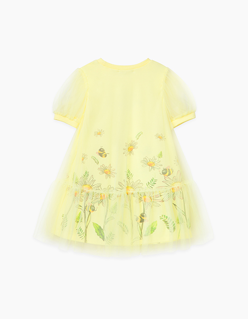 Двухслойное платье-трапеция с оборкой и рукавами-фонариками. Выполнено из кулирной глади и сетки светло-желтого цвета. Нижний слой запечатан по кругу изображением ромашкового луга и пчелок. Спереди надпись My favorite flower ("Мой любимый цветок")