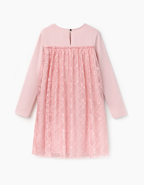 Трикотажное платье А-силуэта с длинным рукавом. Украшено слоем плиссированного кружева в тон основной ткани и декоративной нашивкой из золотистого металла с надписью fashion. Удобная застежка на пуговицу сзади.