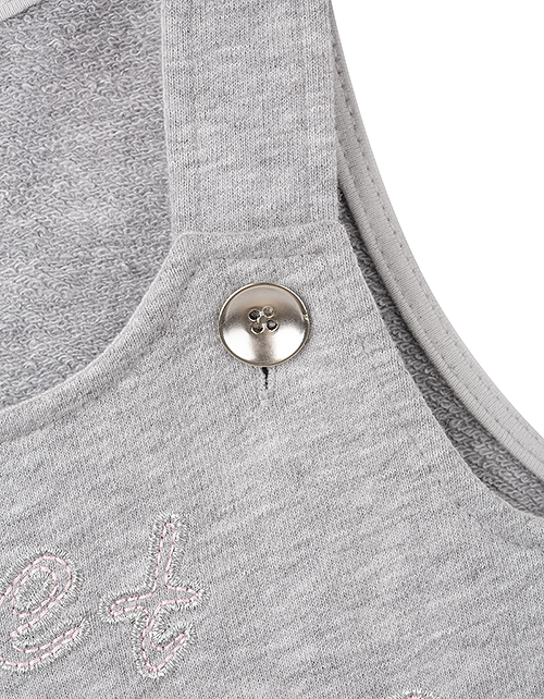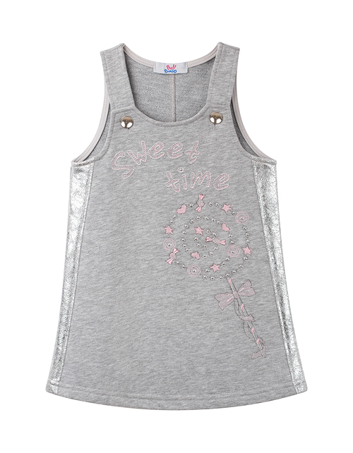 Сарафан с серебристыми вставками по бокам создан для того, чтобы радовать Вашу красавицу. Приятный материал и удобный силуэт дарят заботу и не сковывают движения. Милая вышивка с надписью и сияющая фурнитура складываются в стильный образ