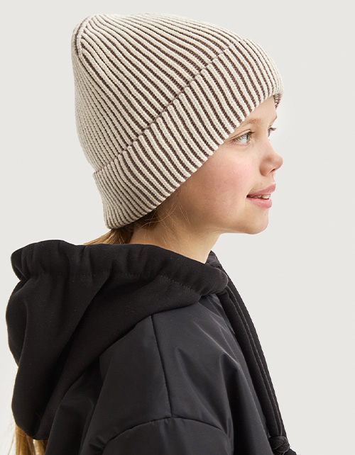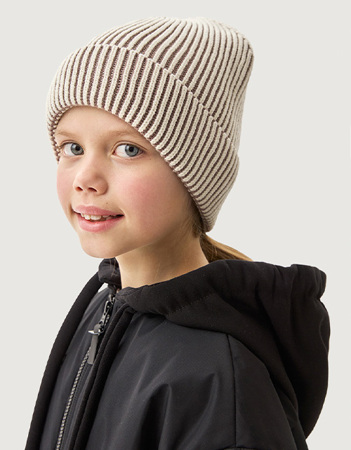 Однослойная шапка цвета молоко-какао для девочки - лёгкая, стильная и удобная. Плюсы: отличная посадка благодаря продуманному крою и вязке, оттенки легко сочетаются с гардеробом, комфорт от -5 до +10°C. Без подкладки - идеально для межсезонья.