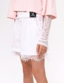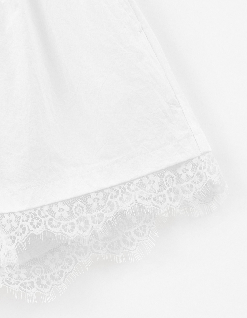 Белые шорты-боксёры из поплина с жатым эффектом выполнены в прямом, широком силуэте. Кружево по низу создаёт романтичный акцент. Мягкий пояс с эластичной лентой и функциональным шнурком обеспечивает комфорт, а накладные карманы добавляют практичности.