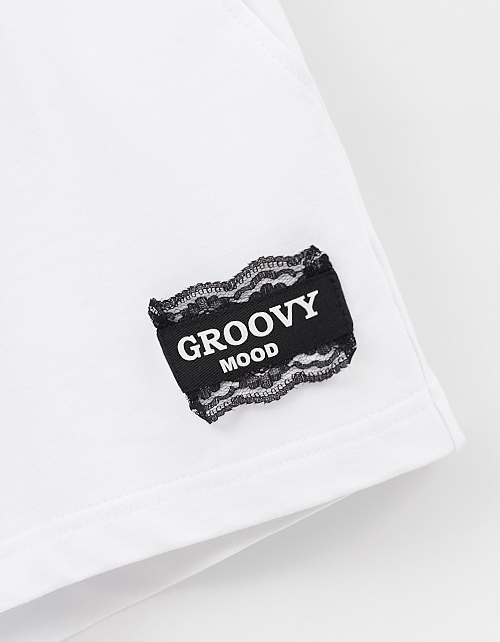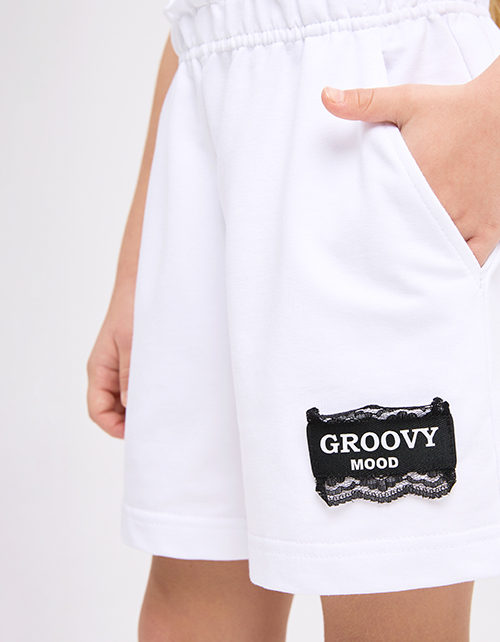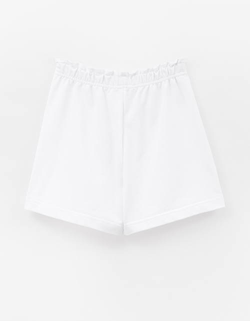 Белые шорты из мягкого футера с прямым, широким силуэтом создают расслабленный образ. Мягкий пояс с романтичной рюшей и эластичной лентой обеспечивает комфорт. Боковые карманы практичны, а лейба с кружевом добавляет аккуратный декоративный акцент.