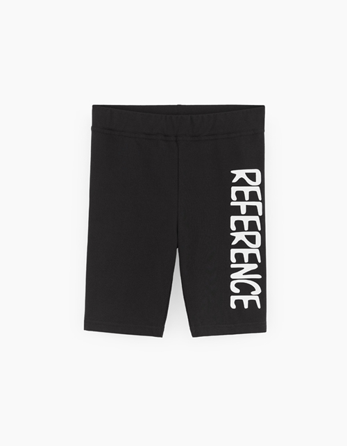 Черные шорты-велосипедки для девочки. Облегающая модель со средней посадкой. Базовое изделие из кулирной глади со шрифтовым дизайном. Шорты составят гармоничный лук как с укороченными и длинными футболками, так и с объёмными свитшотами и худи.