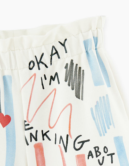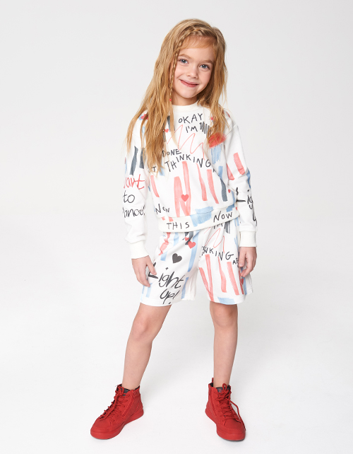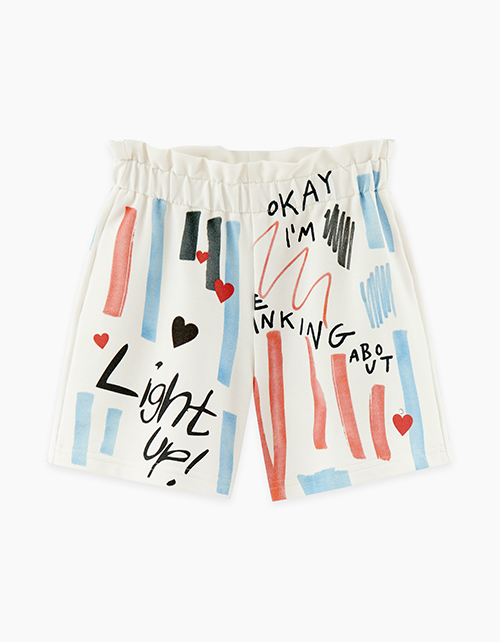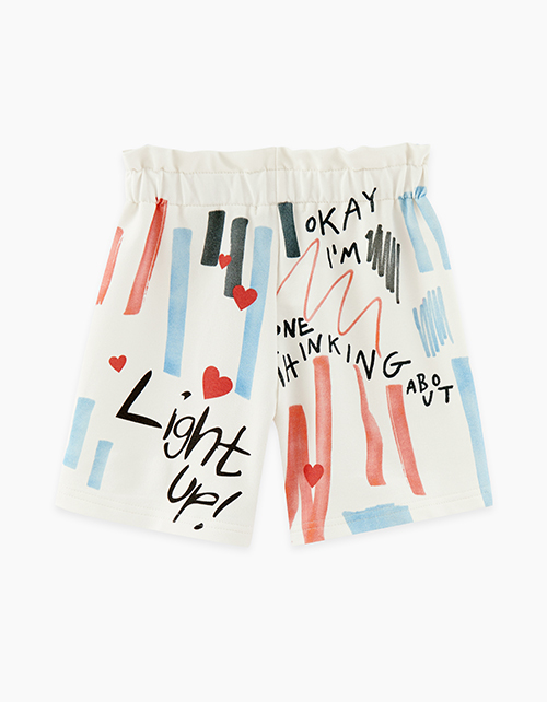 Летние шорты для девочки. Стильная модель на эластичном поясе декорирована тематическими принтами и стразами. Шорты с карманами в шве.