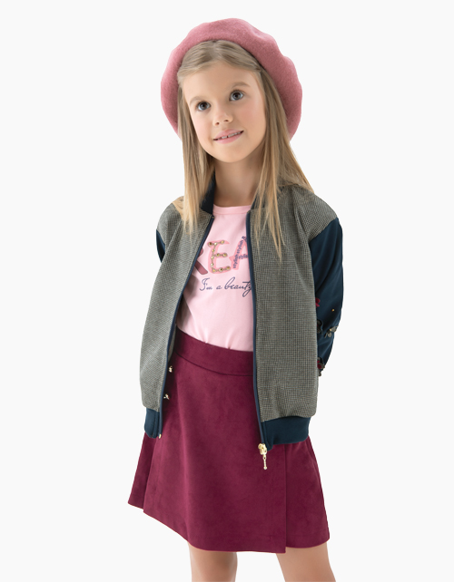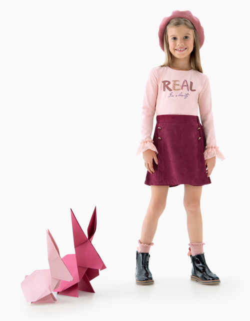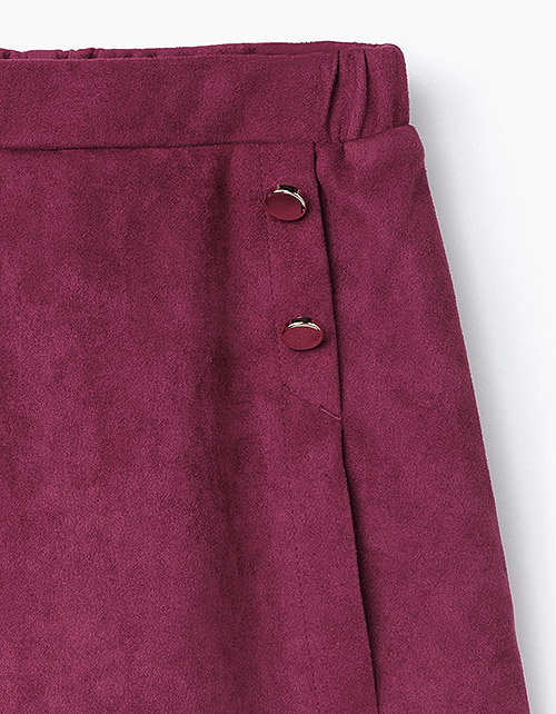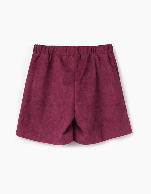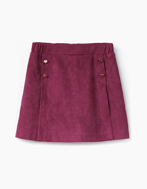 Шорты-юбка бордового цвета из искусственной замши - модный и удобный предмет гардероба для девочки. Декорированы золотыми пуговицами спереди. Пояс с эластичной лентой внутри гарантирует комфортную посадку.