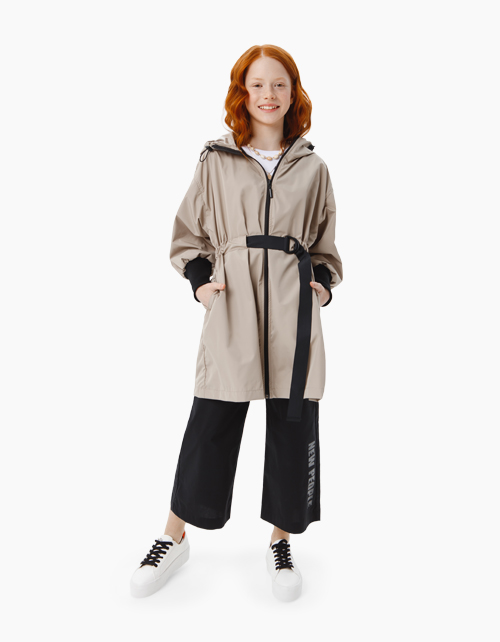 Плащ свободного силуэта выполнен из бежевой плащевой ткани. Высокие манжеты из черной рибаны поддержаны другими контрастными акцентами: поясом из тесьмы, шнуром на капюшоне, отделкой молнии и швов. Левый рукав декорирован концептуальной нашивкой
