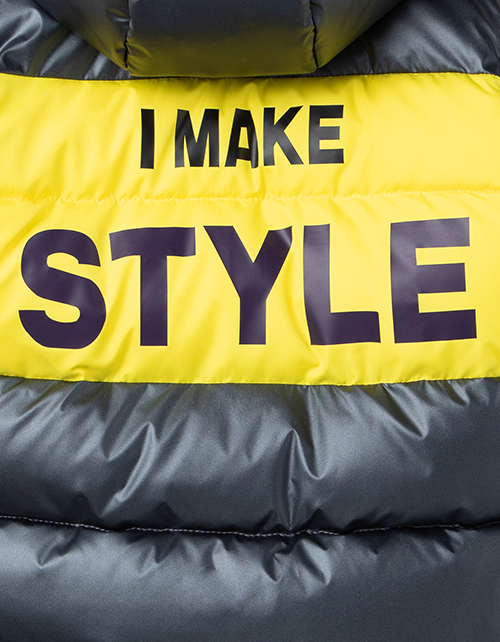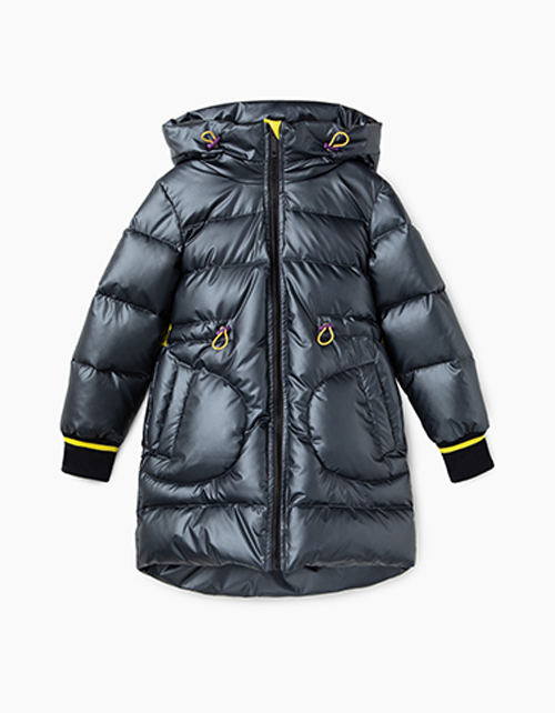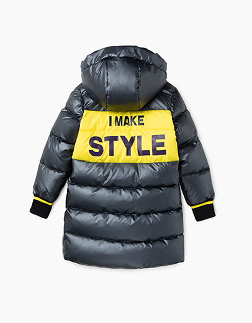 Зимняя куртка для девочки. Из плащевой ткани с блеском. Утеплитель - синтепух, подкладка из флиса. Воротник и манжеты из трикотажа со шрифтовым дизайном. Контрастная вставка с принтом на спинке. Удобные карманы