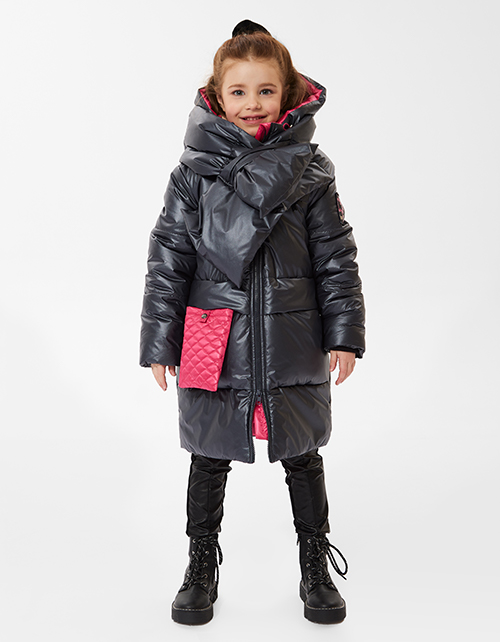 Стильная зимняя куртка с модным аксессуаром - лимитированным шарфом. Модель с акцентным элементом в виде отстегивающейся сумочки и накладными карманами. Куртка выполнена из функциональной и простой в уходе ткани с модной фактурой "эко-кожи".