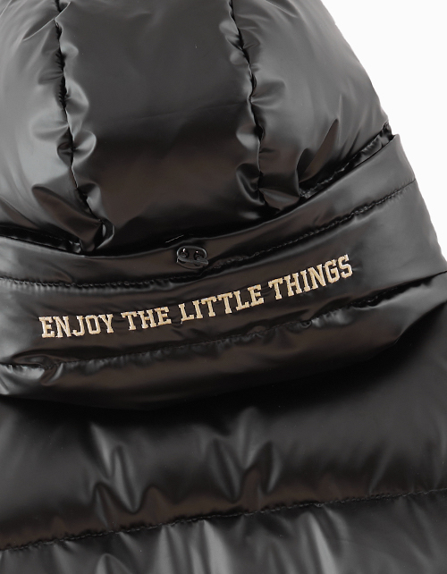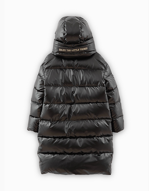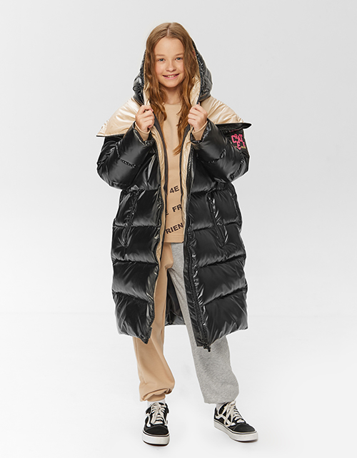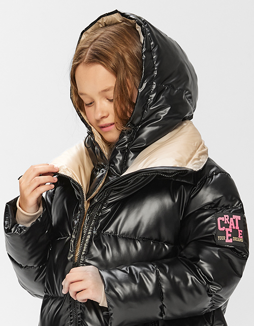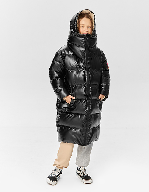 Черное зимнее пальто для девочки. Акцентный удлиненный воротник и объемная форма. Модель с боковыми карманами декорирована вышивкой.