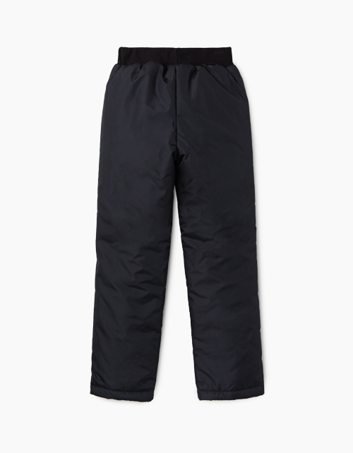 Теплые брюки для девочки. Прямого силуэта, на эластичной трикотажной резинке. Выполнены из плащевой ткани черного цвета с водоотталкивающими свойствами. Утеплены синтепоном