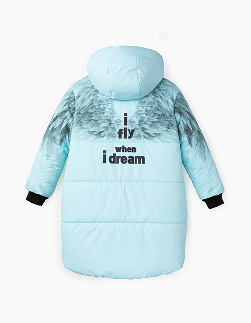 Двусторонняя куртка из ткани ponge черного и мятного цветов. На спинке и рукавах с одной стороны - принт в виде крыльев и надписи I fly when I dream ("Я летаю во сне"), на обратной - контрастные надписи