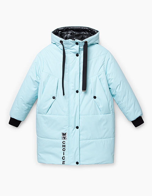 Двусторонняя куртка на утеплителе синтепон. Трикотажный воротник и манжеты, притачной капюшон. Застёжка на кнопки с одной стороны и застёжка "трактор" с другой. Декорирована шрифтовой композицией с двух сторон.
