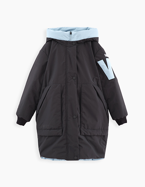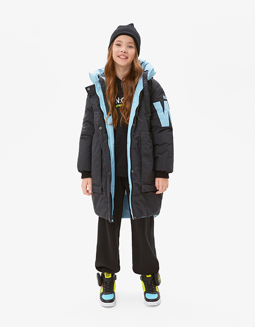 Двусторонняя зимняя куртка с капюшоном. Ветрозащитная планка. Объёмные карманы. Мягкие трикотажные манжеты по рукавам. Гипоаллергенный силиконизированный синтепон в качестве утеплителя. Нашивка-лейбл и вышивка. Функциональные ленты по капюшону.