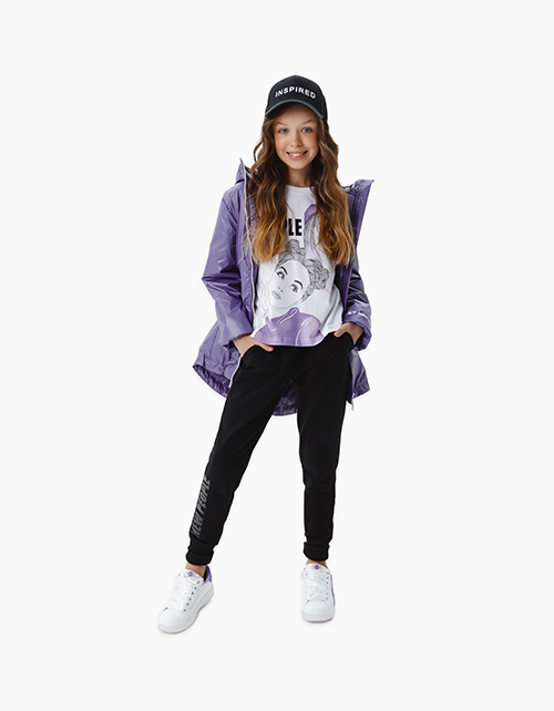 Демисезонная куртка с капюшоном из фиолетовой плащевой ткани. С удлиненной спинкой и перенесенными боковыми швами. Декорирована надписями белого цвета вдоль кармана спереди и по центру сзади. Авторский принт на подкладке передает тематику капсулы