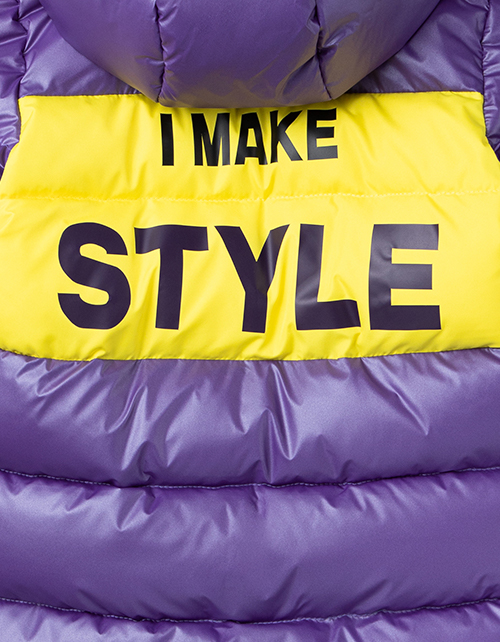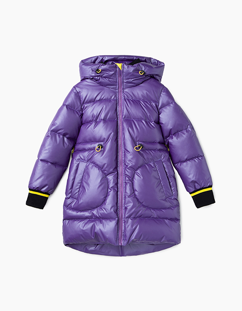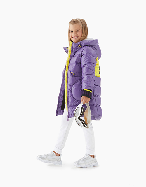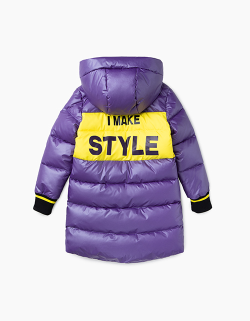 Зимняя куртка для девочки. Из плащевой ткани с блеском. Утеплитель - синтепух, подкладка из флиса. Воротник и манжеты из трикотажа со шрифтовым дизайном. Контрастная вставка с принтом на спинке. Удобные карманы