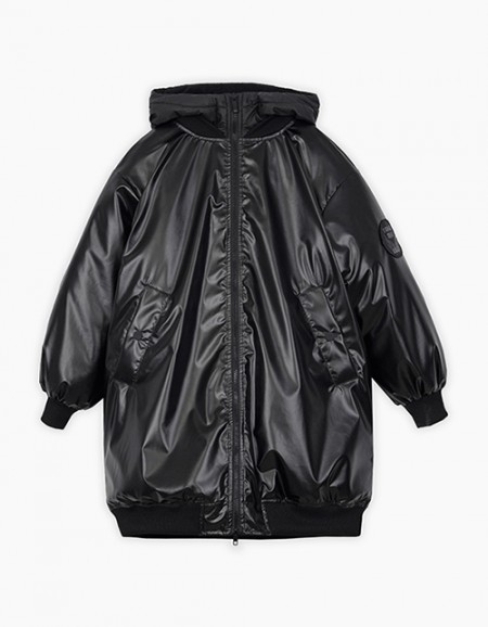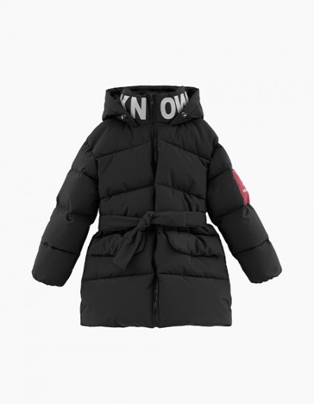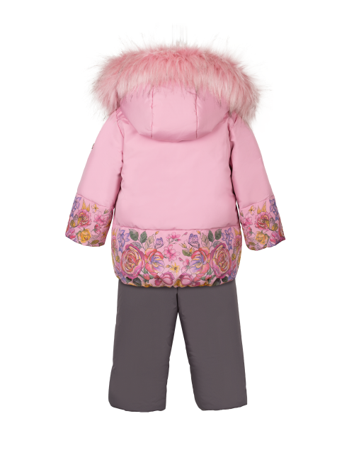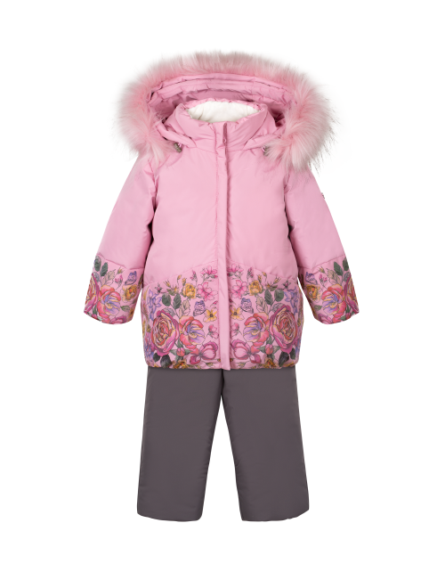 Пуховой зимний комплект для девочки состоит из куртки и полукомбинезона в контрастных тонах. Куртка свободного силуэта дополнена капюшоном с мехом и стильным цветочным принтом по низу изделия. Полукомбинезон имеет застежку молнию и лямки на резинках.