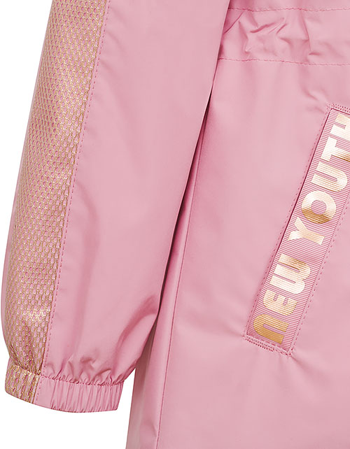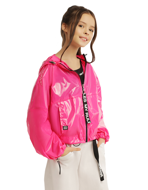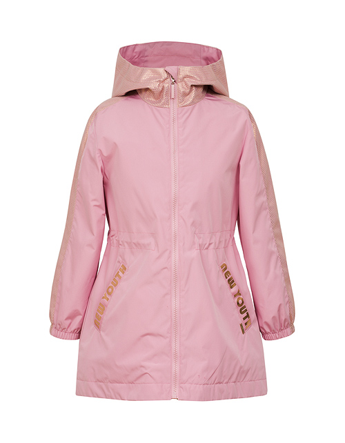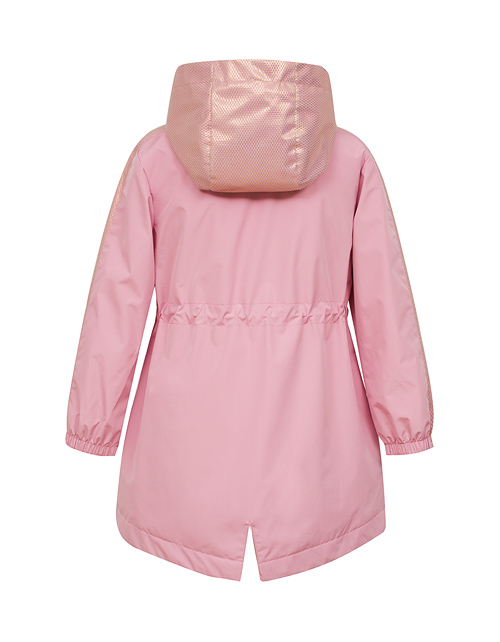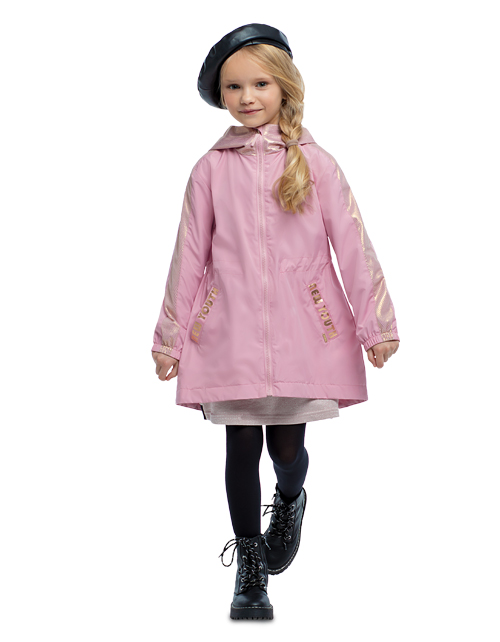 Удлиненная розовая куртка-плащ для девочки. Прямой силуэт со спущенным рукавом. Капюшон, застежка на молнию. Прорезные карманы-листочки в нижней части переда.