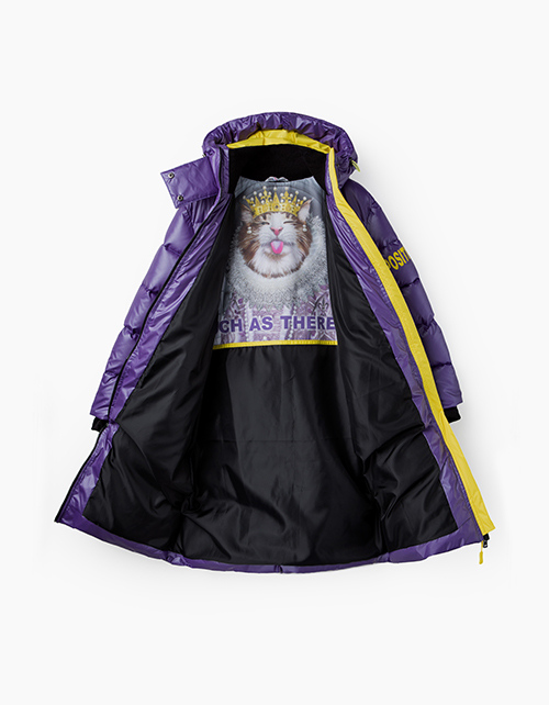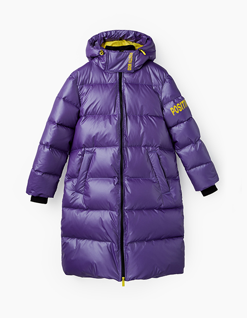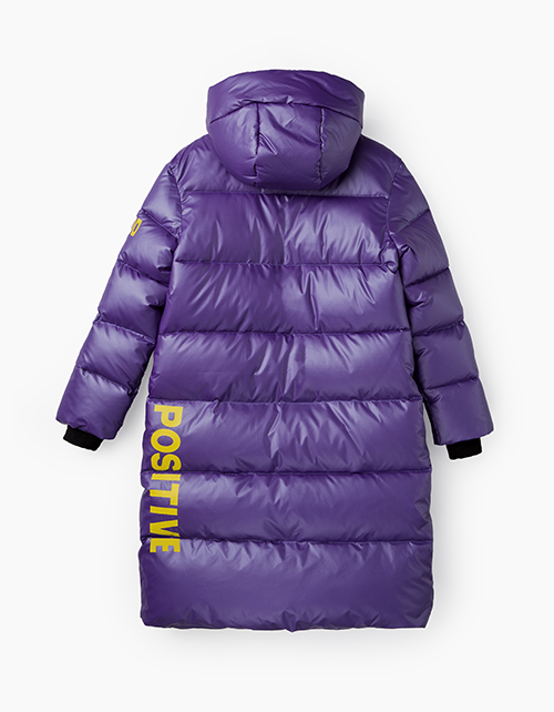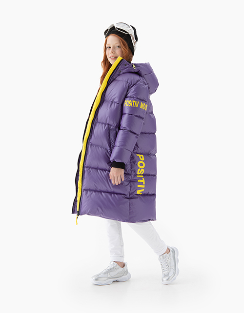 Стильная удлиненная куртка на холодную зиму для девочки-подростка. Выполнена из фиолетовой плащевой ткани с блеском.