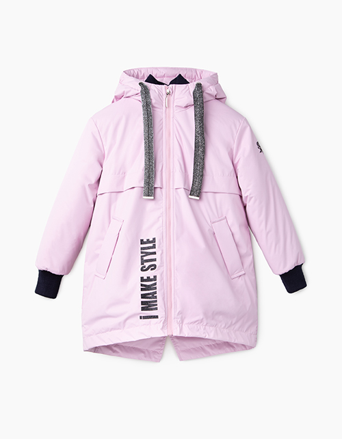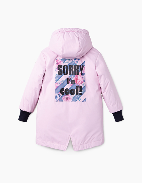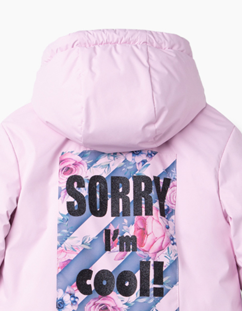 Ультрамодная куртка-парка для девочки. Из водоотталкивающей ткани светло-розового цвета. Утеплена синтепоном. Подкладка из флиса и нейлона. Капюшон с серебристой регулирующей тесьмой. Декорирована крупными принтами