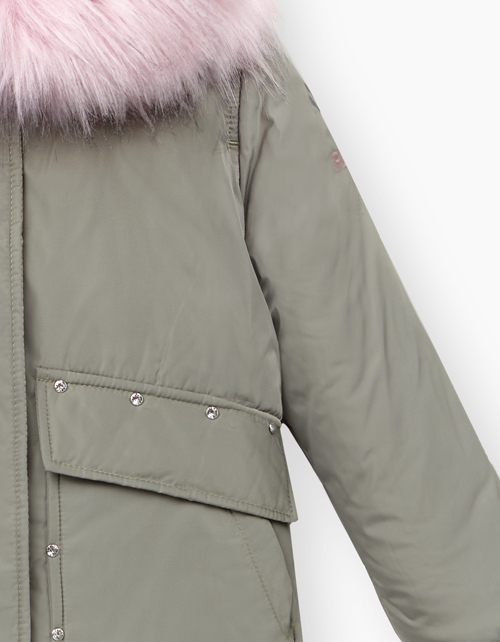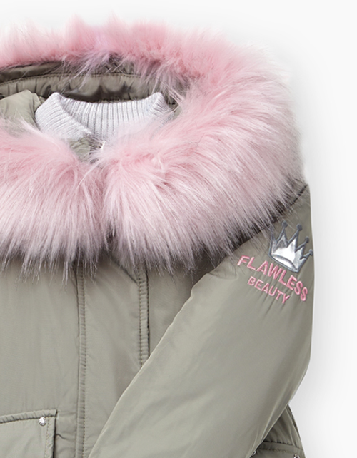 Зимняя куртка-парка на синтепоне. Из плотной ткани Добби. На подкладке из флиса. Капюшон с опушкой. Застежка на молнию и потайные кнопки. Отделка стразами. Левый рукав декорирован вышивкой с аппликацией глиттером