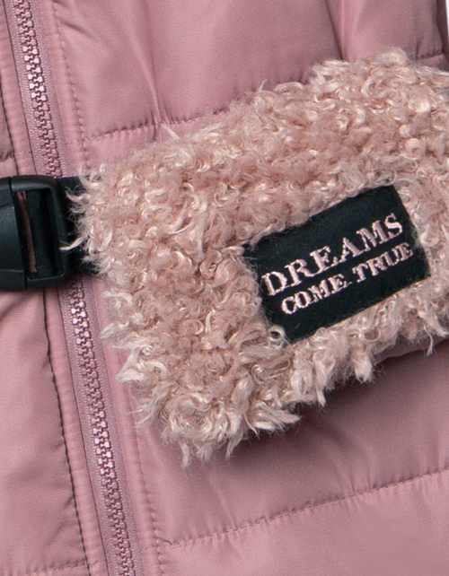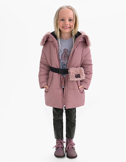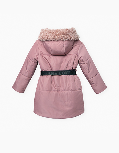 Темно-розовая зимняя куртка прямого силуэта с прогнутой по низу удлиненной спинкой. С черным поясом из репсовой ленты с принтом. Подкладка капюшона и съемная поясная сумочка из трендового искусственного меха.