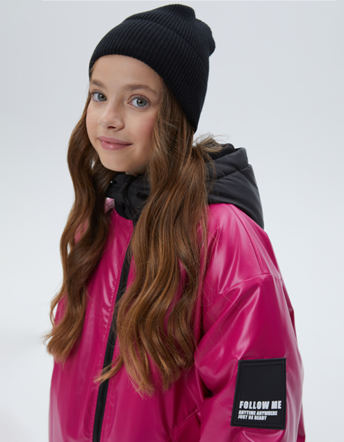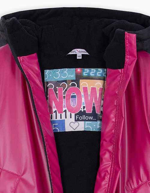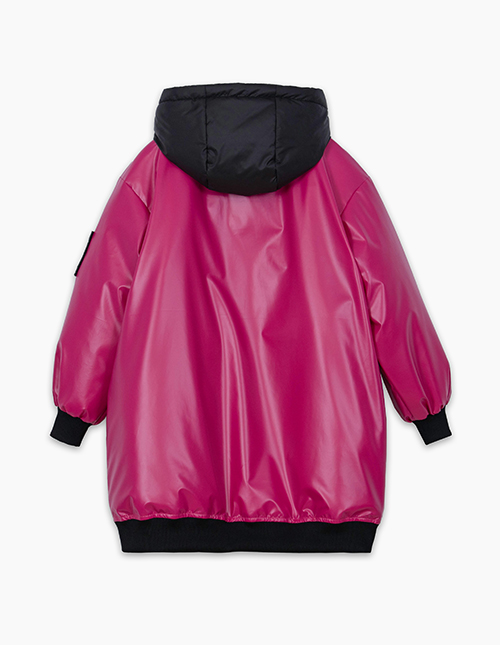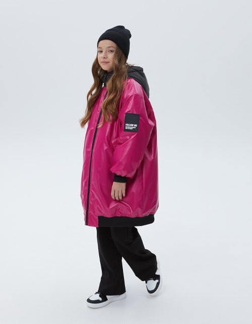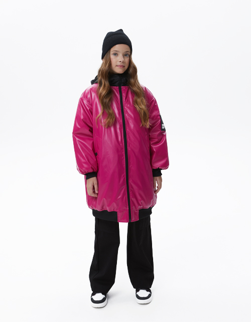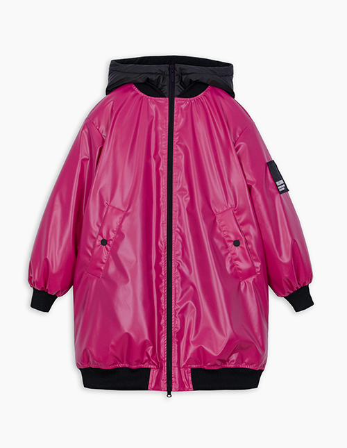 Удлинённый бомбер сочного оттенка маджента для девочки. Модель на молнии, капюшон с подкладкой на флисе. Мягкие манжеты на рукавах и по низу изделия. Куртка с ветрозащитной планкой и вместительными карманами на флисе. Авторский принт на подкладке.