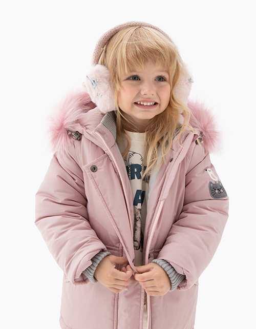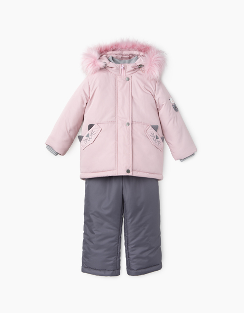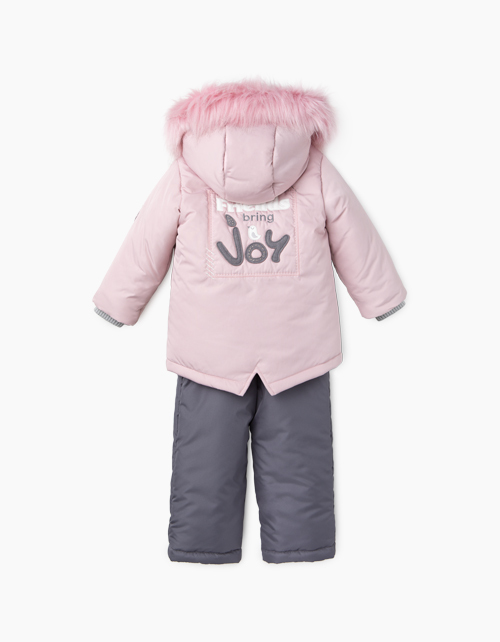 Зимний комплект для девочки. Куртка-парка с фигурным низом и полукомбинезон из водоотталкивающей ткани. На трикотажной подкладке и синтепоне. Кармашки-котики, вышивка на спинке и рукаве. Притачной капюшон с опушкой