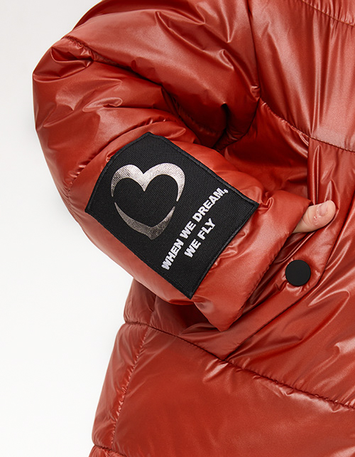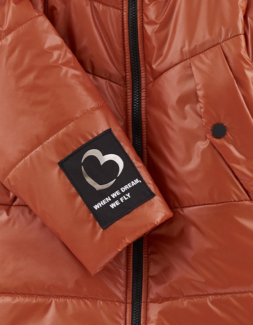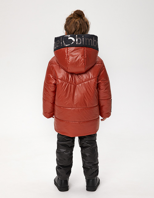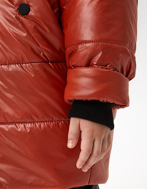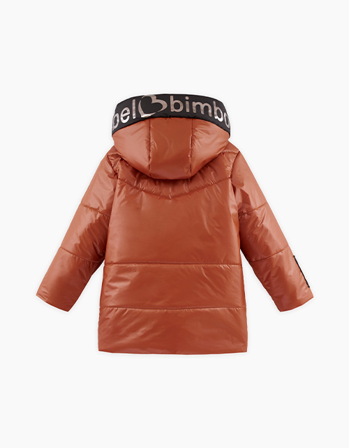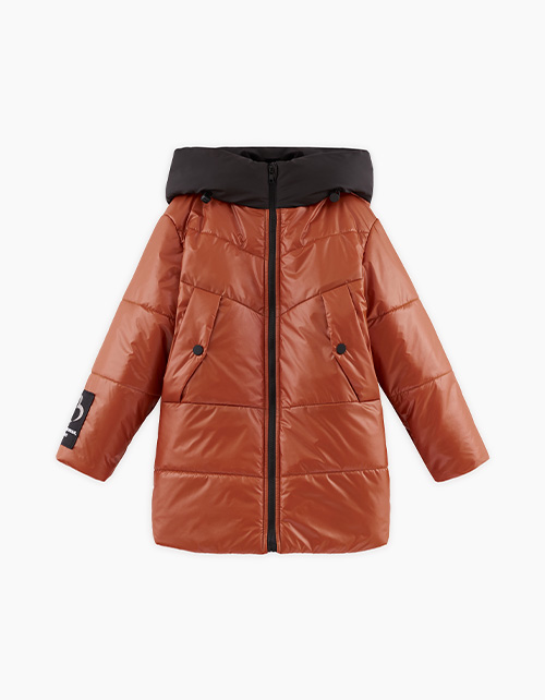 Куртка с блеском в медном оттенке. Интересная стёжка. Комбинированная подкладка из флиса и нейлона. Глубокий капюшон с акцентным декором. Трикотажные внутренние манжеты и воротник. Гипоаллергенный силиконизированный синтепон. Рекомендовано до -20.