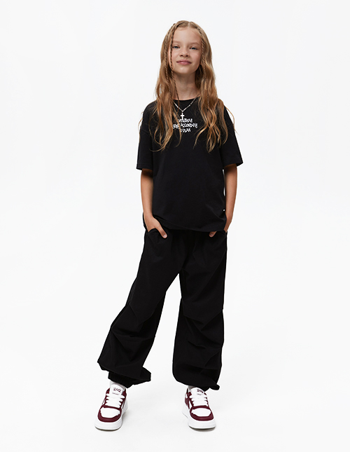 Модная чёрная юбка для девочки. Модель комфортного трапециевидного силуэта со средней посадкой. Изделие без застёжки, на мягком поясе. Юбка из твила с накладными карманами-карго с клапанами.