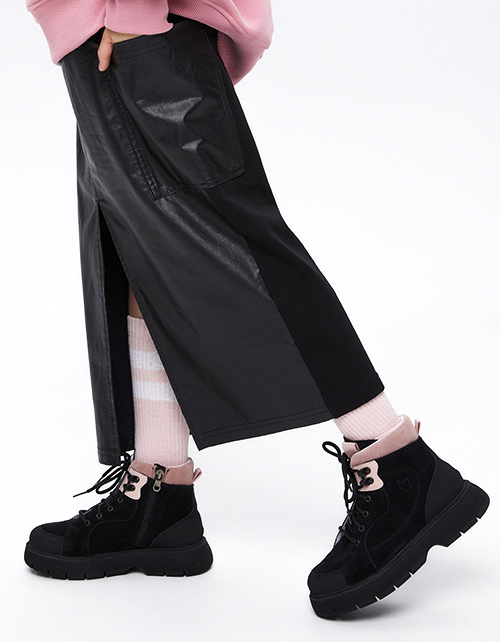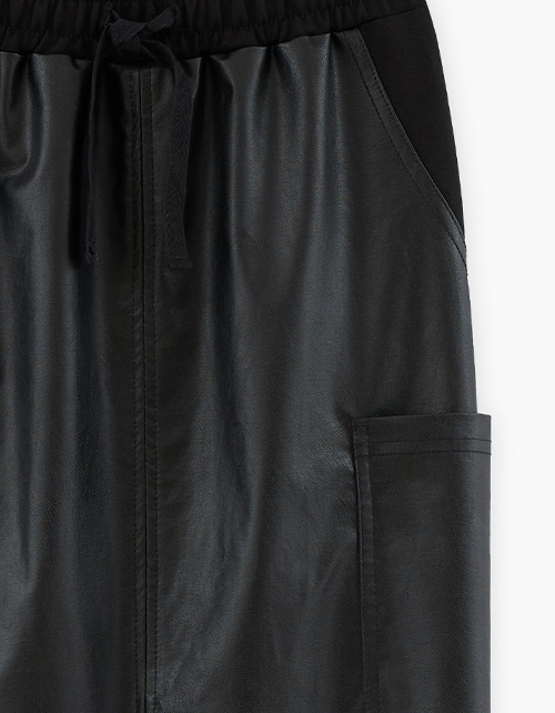 Стильная комби юбка для девочки. Модель прямого силуэта со средней посадкой. Изделие без застёжки, на мягком эластичном поясе. Комбинация материалов: футер и эко-кожа. Юбка дополнена карманами-хулиганами сверху и накладными-карго по бокам в области колен.