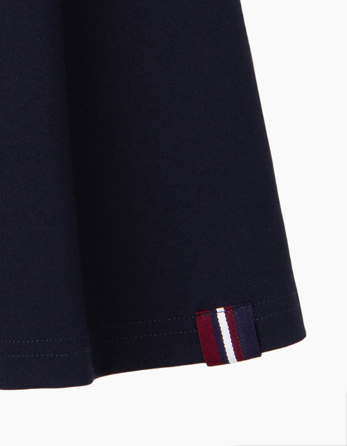 Темно-синяя расклешенная юбка из лимитированной школьной коллекции. Сделана из джерси, хорошо держит форму и не мнется. Справа снизу - небольшой декор трикотажной тесьмой, которая используется в жакетах из этой же капсулы.