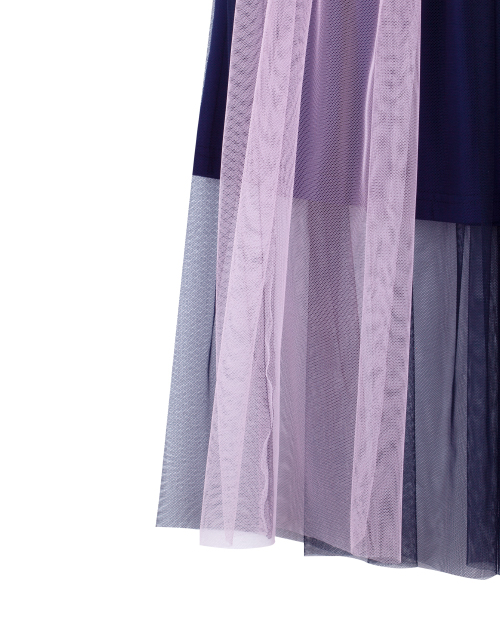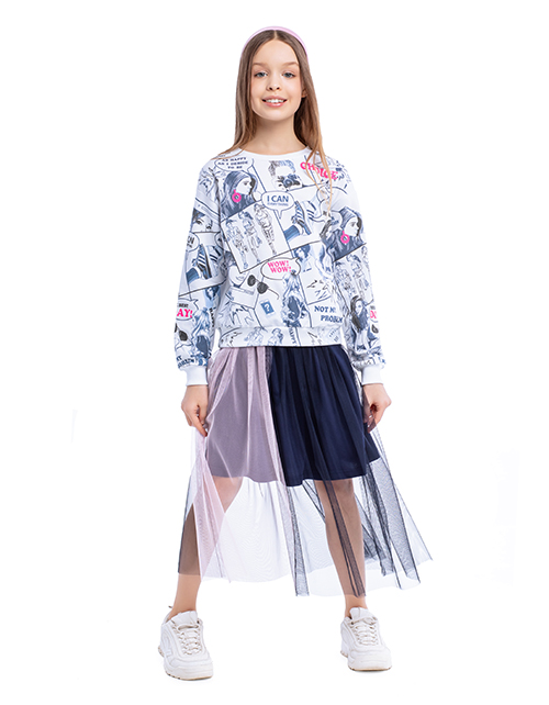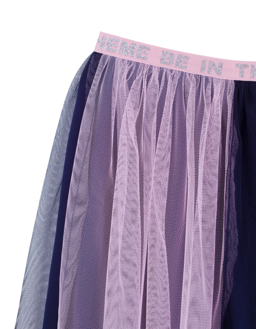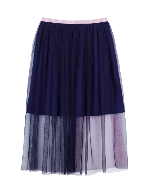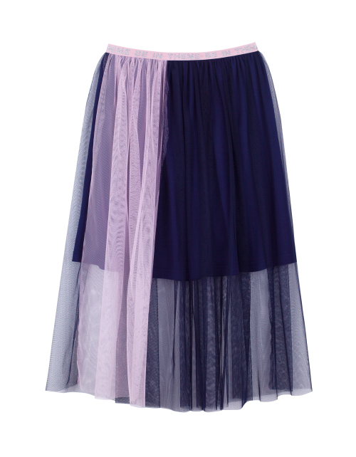 Темно-синяя юбка для девочки со светло-розовым поясом на эластичной резине. Прямой, расширенный к низу силуэт. Дизайнерское оформление в стилистике капсулы "Миллион лайков".