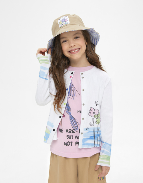 Белый жакет для девочки. Модель прямого силуэта из кашкорсе. Модное изделие с контрастными разноцветными кнопками-застёжками. Жакет с авторским цифровым принтом.