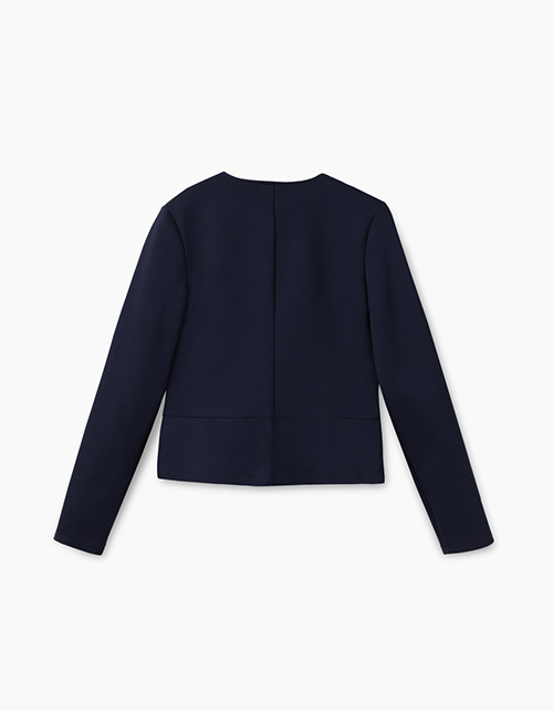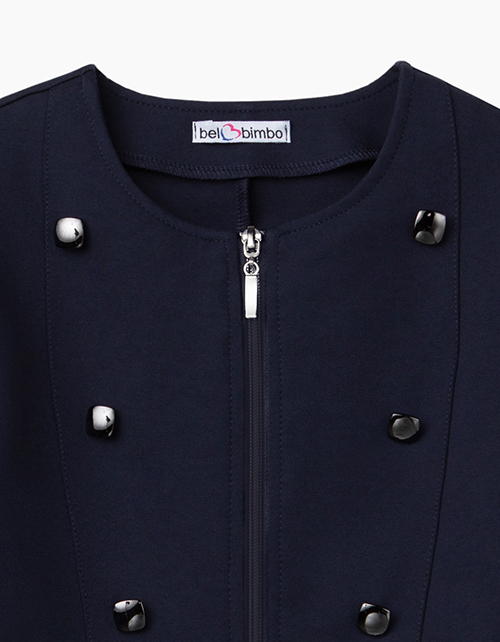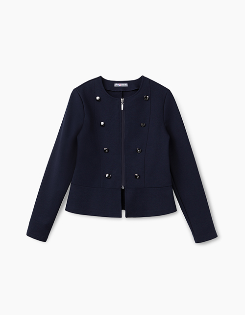 Однотонный короткий жакет из джерси с отрезной баской. Застегивается на серебристую молнию. Декорирован пуговицами с двух сторон от замка.