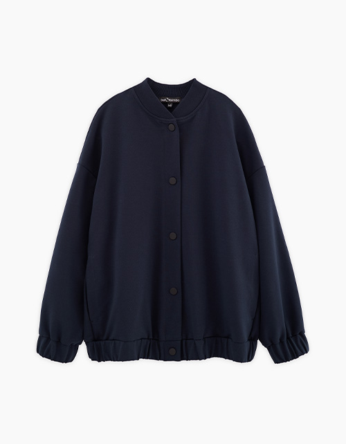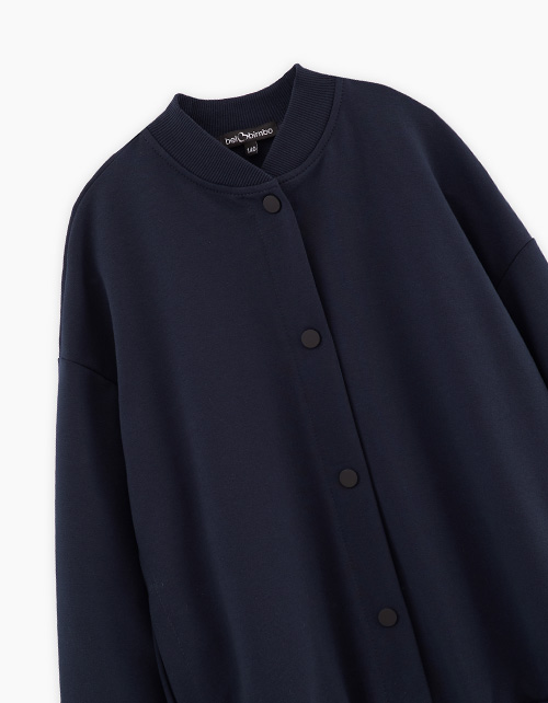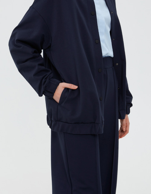 Стильный тёмно-синий жакет-бомбер для девочки. Модель оверсайз. Спущенная линия плеча. Воротник из эластичной рибаны. Манжеты и низ изделия со сборкой на резинке. Карманы в боковых швах. Комфортная застёжка на кнопки.