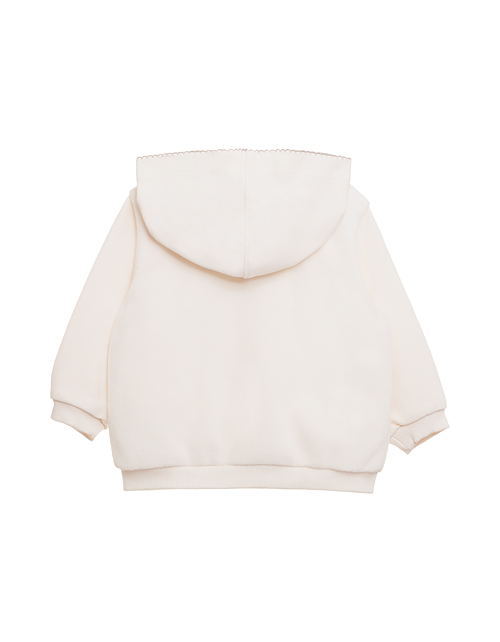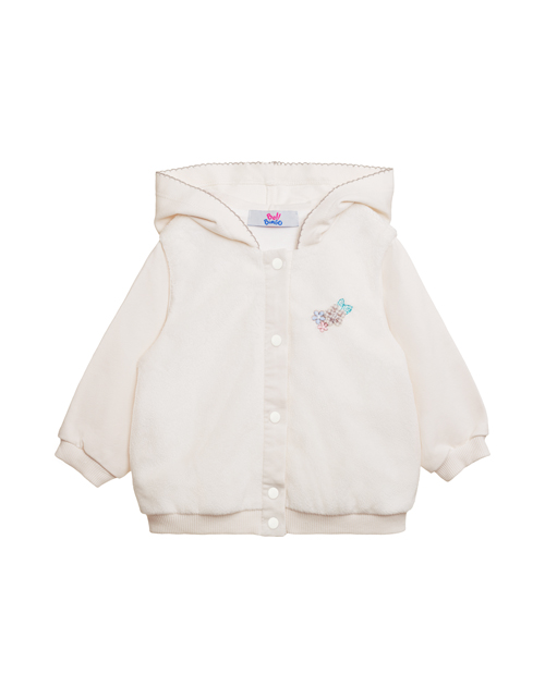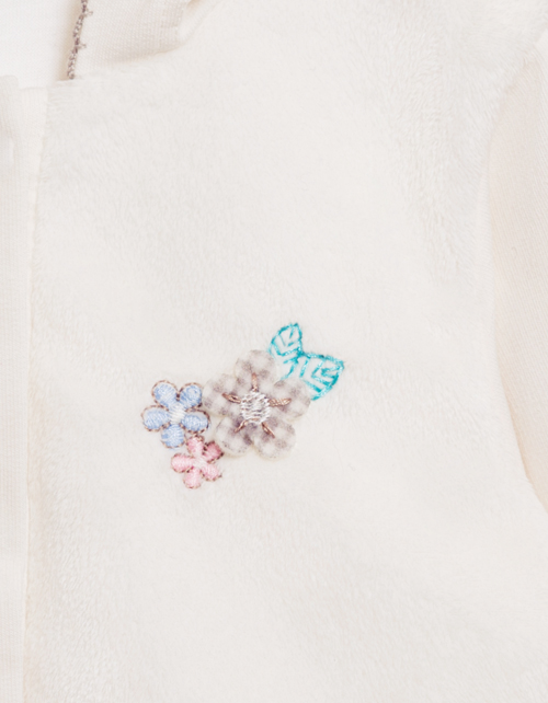 Пушистая теплая и уютная кофточка для самой нежной девочки! Удобные пуговки, манжеты, свободный крой и "плюшевая" фактура дарят комфорт. Прелестная вышивка с цветочком и имитация вышивки крючком по контуру капюшона придают особое очарование образу.