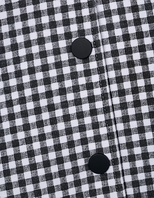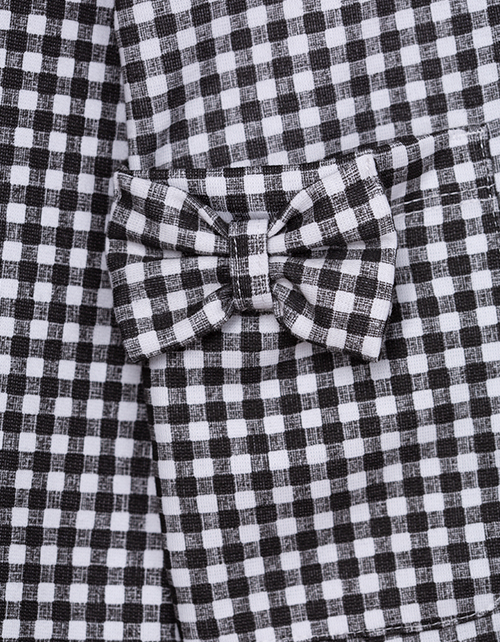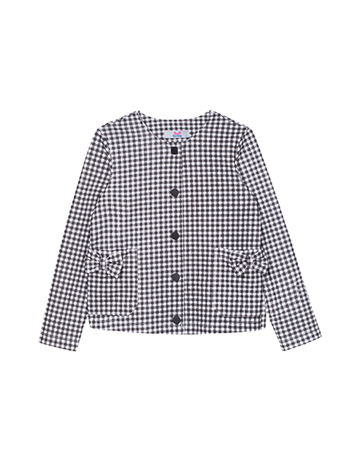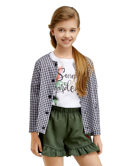 Стильный жакет в клетку для настоящей маленькой леди. Украшен оригинальной кокетливой рюшей и дополнен удобными накладными карманами. Отвороты рукавов декорированы контрастной тканью с озорным цветочным принтом, разбавляющим монохромность образа