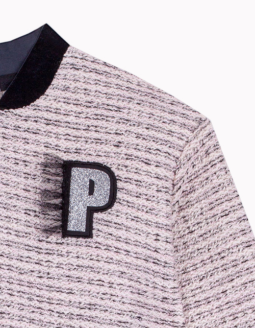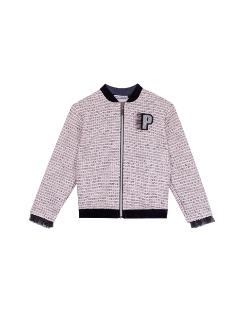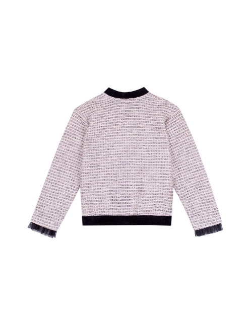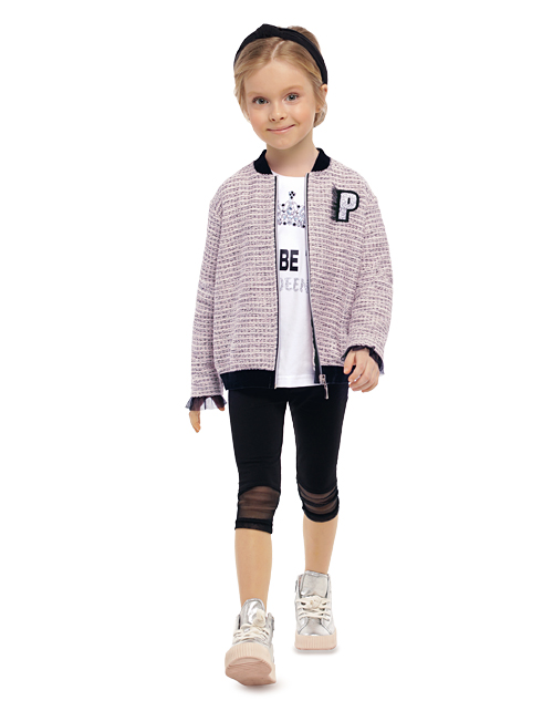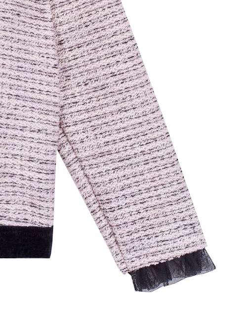 Жакет для девочки с круглым вырезом горловины. Полотно с включением мягкого люрекса. Декоративные рукава из сетчатого полотна с оборками. Дизайнерское оформление в стилистике капсулы "Модная тусовка".