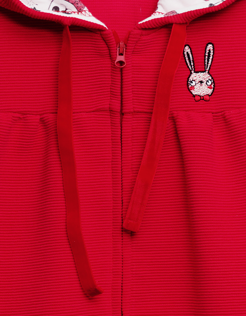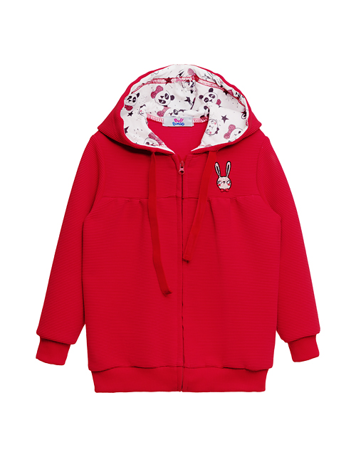 Жакет на молнии с капюшоном и кармашками из плотной ткани с мягкой подкладкой, украшенной милым рисунком зверей, понравится всем. Веселые зайцы с вышитыми ушками и щечками заставят улыбнуться малышку, а мягкие натуральные ткани позаботятся о её здоровье.
