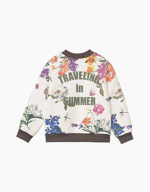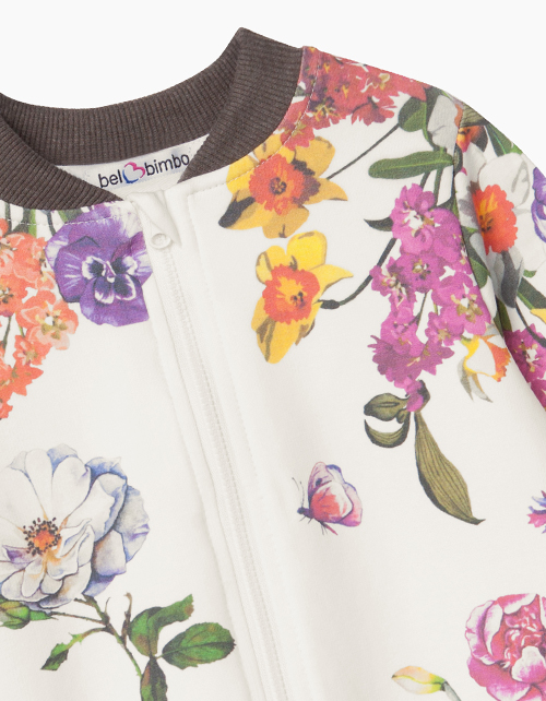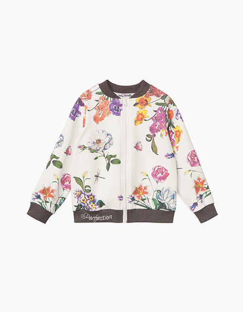 Стильный жакет-бомбер с застежкой-молнией для девочки. С набивным флористическим рисунком на белом фоне. Воротник, манжеты и низ отделаны рибаной цвета хаки. Украшен принтом из страз "Pefection"