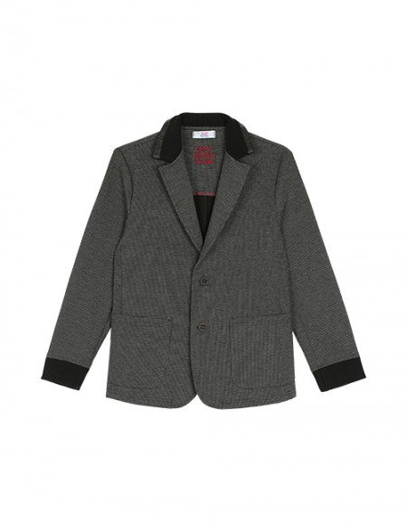 Жакет-бомбер из серого меланжа с застежкой-молнией для девочки. Декорирован спереди нашивкой в виде хэштега, сзади - фотоколлажем с нарисованным персонажем. Контрастная отделка из рибаны по низу модели. Манжеты и горловина - в тон основной ткани
