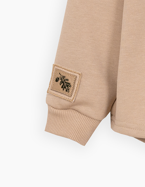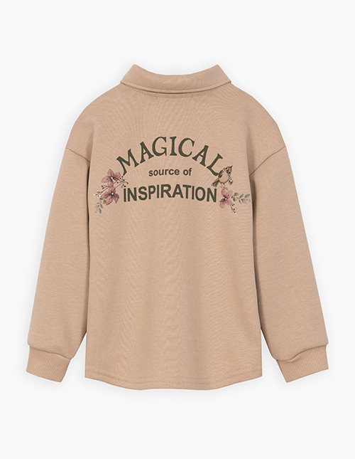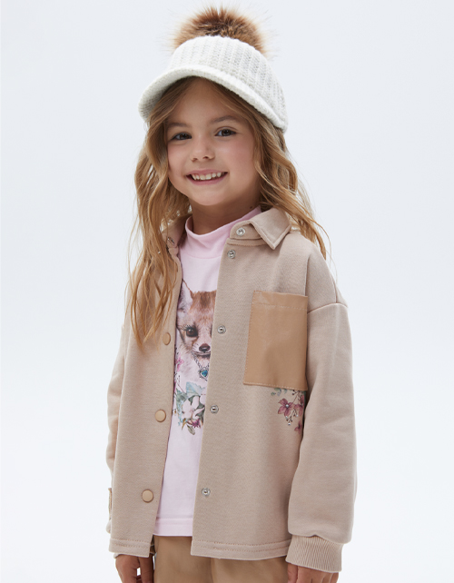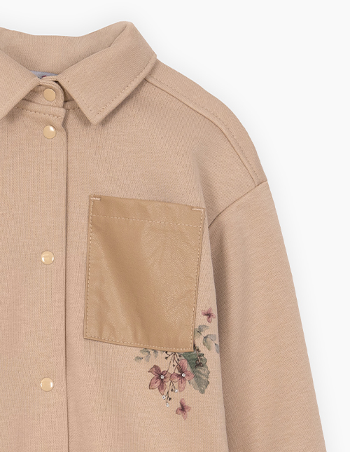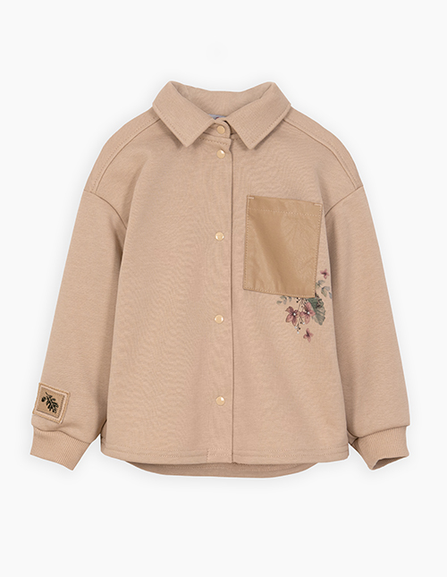 Оригинальный жакет-рубашка в бежевом оттенке для девочки. Модель из футера с накладным карманом из эко-кожи. Жакет прямого силуэта с застёжкой на кнопки. Отложной воротник, мягкие манжеты из рибаны. Изделие декорировано авторской лейблой и стразами.